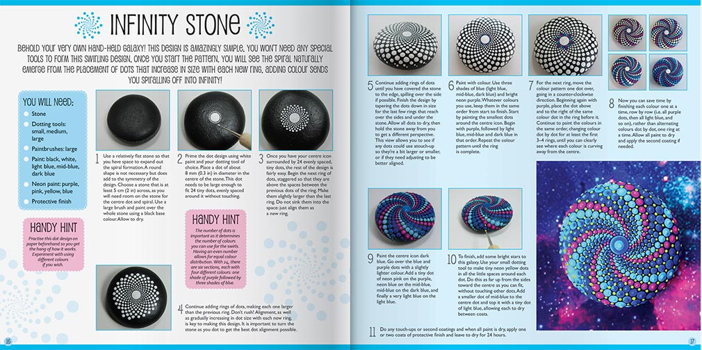 Create stunning, unique pieces of art to wow and delight friends and family with this on-trend kit. Neon Painted Rocks contains 4 large, porous rocks that are perfect for this type of art, 3 neon paints, 2 black and white paints, 2 high quality paint brushes, 5 dotting tools of varying thickness, and a 24-page book containing a step-by-step instructions and photography on how to create a range of stunning pieces!